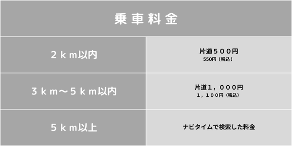 ・5km以上はナビタイムで検索した料金(検索結果がトップのもの)とします。