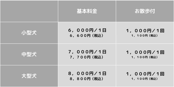 ※ご利用の際は狂犬病・混合ワクチン接種証明書が必要となりますのでご注意ください。